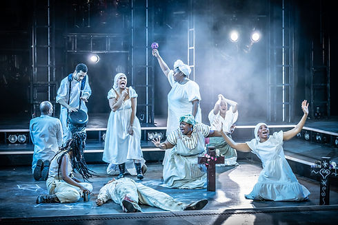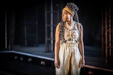 Once on this Island is directed by Ola Ince and she make very effective use of the natural surroundings plus the simple stage. The set (designed by Georgia Lowe) consists of a two level stage with a sunken section (which is used very effectively in act two). Down each side of the stage are tall lighting rig structures which the cast climb as if they are trees, and rotate with mirrors on them. I really liked the staging of this show. The direction thrusts both the beauty of the island, the power of nature, and the cruelty of humans right in front of us and forces us to confront some difficult realities. The actors themselves create the environment for us, with the set design allowing them to do that rather than forcing them to work around it.