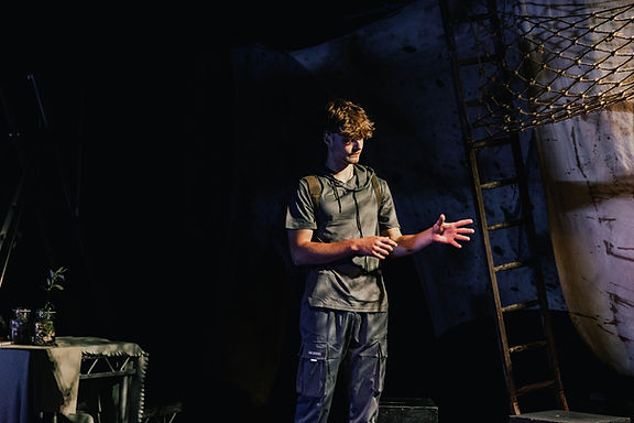 Performed in the ‘black studio’ we were greeted by an atmospheric setting with sails spread across the back wall and fog rising across the space. There is something wonderful about a black box space as it offers so many opportunities and director, Gemma Crooks, and lighting designer, Kory Trantum (who also took on the role of Stage Management, along with Aleesha Evans), worked wonders with this one.
